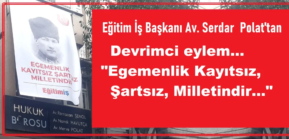 Eğitim İş Bandırma Şube Başkanı Av. Serdar Polat İstiklal caddesindeki Hukuk bürosunun camına astığı Atatürk'ün kalpaklı fotoğrafı ile “Egemenlik Kayıtsız Şartsız, Milletindir.” söylemini astı.