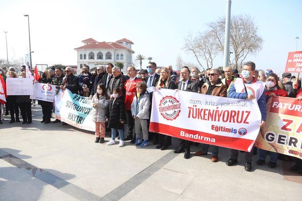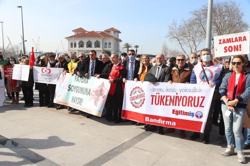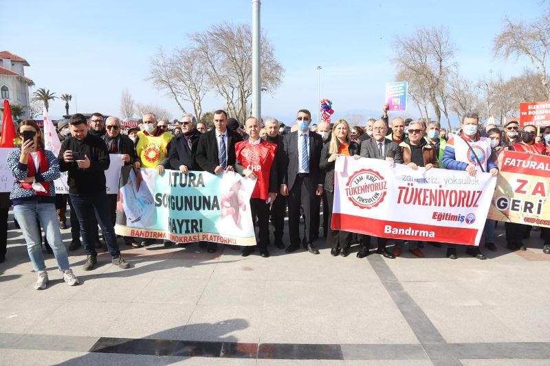 CHP Bandırma İlçe Örgütünün dışında; Bandırma Belediye Başkan Vekili Mesut Özdemir, Belediye Meclis Üyeleri, İYİ Parti, Genç Parti, Gelecek Partisi, Muhtarlar, STK başkan ve temsilcilerinin yanı sıra vatandaşlar da ellerinde faturalar ile enerjiye gelen yüksek zamları protesto ederek basın açıklamasına katıldı.