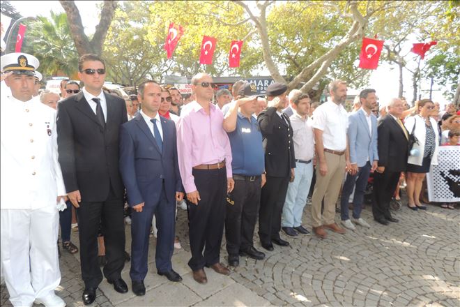 Erdek Kaymakamı Ekrem Çalık, Garnizon Komutanı Albay Ateş Kalkan ve Belediye Başkanı Mimar Hüseyin Sarı´nın, kaymakamlık makamında kutlamaları kabulünün ardından cumhuriyet alanında törene geçildi. Kaymakamlık, Garnizon Komutanlığı ve Belediye Başkanlığı çelenklerinin Atatürk anıtına sunulmasından sonra günün anlam ve önemini vurgulayan konuşmayı Deniz Binbaşı Volkan Kadir Özbilir yaptı. 30 Ağustos´un, tarihimizin en büyük zaferi olduğunun altını çizen Özbilir, "Bugünün değerini anlamak için tarihimizi anlamalı ve çok iyi bilmeliyiz. 30 Ağustos, Mustafa Kemal´in önderliğinde ordusuyla bütünleşen Türk Milleti´nin zaferidir. Bu zafer, yeni Türk devletinin kuruluşunu da sağlamıştır" dedi.