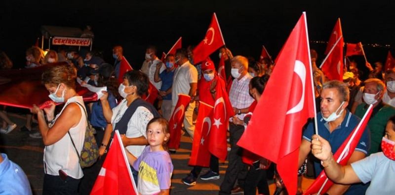 Erdek Belediyesi’nin koordinasyonunda, Ali Haydar Sarı Sahil Bandı’nda, saat 20.30 dolaylarında toplanan Erdekliler, sivil toplum kuruluşları ve ilçede konuk olarak bulunan vatandaşlar, ellerinde Türk bayraklarıyla cumhuriyet alanına kadar yürüdüler. “Zafer Alayı”na çok kalabalık bir topluluk katıldı.