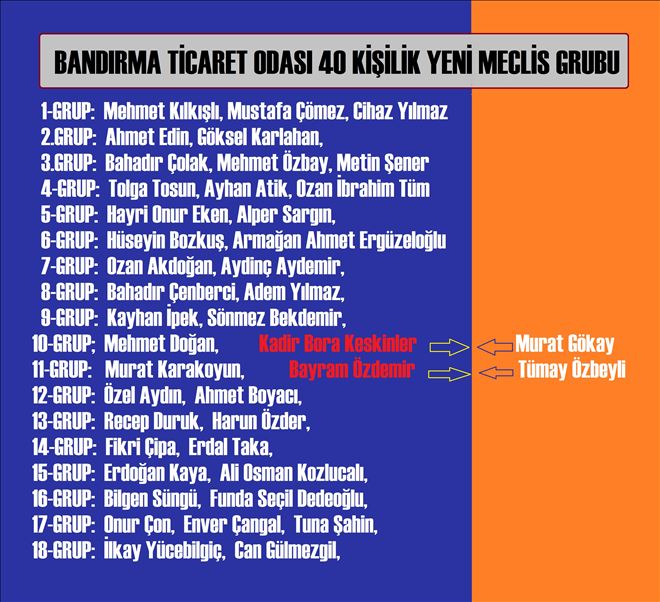 Mavi Grup adına Mehmet Kılkışlı, Turuncu Grup adına Gürkan İlgin´in başkanlık için yarıştığı Bandırma Ticaret Odası seçimlerinde, toplam 18 meslek komitesi için de yaklaşık 76 aday seçilebilmek için ter döktü. Mevcut başkan Mehmet Kılkışlı´nın Başkan Adayı olduğu Mavi Grup, 18 meslek komitesinden de başarıyla çıkarak tarihi bir farka imza attı. Başkan Kılkışlı´nın da yarıştığı 1. meslek komitesinde mavi grup 77, turuncu grup ise 29 oy aldı. 2´inci meslek komitesinde maviler 39, turuncular 23. 3´inci meslek komitesinde maviler 86, turuncular 55. 5´nci meslek komitesinde maviler 41, turuncular 34. 6´ncı meslek komitesinde maviler 25, turuncular 11. 7´nci meslek komitesinde maviler 42, turuncular 28. 8´nci meslek komitesinde maviler 58, turuncular 35. 9´ncu meslek komitesinde maviler 24 turuncular11. 10´ncu komitede maviler 38 turuncular 37.11´ncı komitede maviler 28 turuncular 27.12´ncı komitede maviler 32, turuncular 26 oy aldı. 13´ncu komitede maviler 39, turuncular 16 oyda kaldı. 14´uncu komitede maviler 19, turuncular 18. 15´ncı komitede maviler 25 turuncular 22. 16´ıncı komitede maviler 46, turuncular 19. 17´nci komitede maviler 64, turuncular 43.18´ncı komitede maviler 18, turuncular 14 oy aldı. 4´uncu meslek komitesinin seçimlerinde Mavi ve Turuncu grubun yanı sıra beyaz grupta yarıştı. İnşaat sektörü temsilcilerinin yarıştığı bu grupta da ipi göğüsleyen yine Mavi Grup oldu.