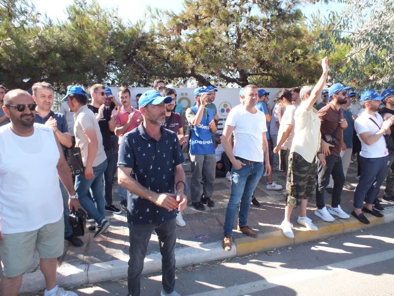 Topuz’un konuşması sırasında işçiler çeşitli sloganlar atıp, düdük çaldılar.