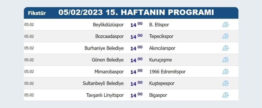 Haftanın diğer karşılaşmaları yine aynı gün ve aynı saatte Burhaniye Belediyespor-Akıncılarspor, Tavşanlı Linyitspor-Bigaspor, Bozcaadaspor-Tepecikspor, Mimarobaspor-1966 Edremitspor, Sultanbeyli Belediyespor-Kuştepespor arasında oynanacak.