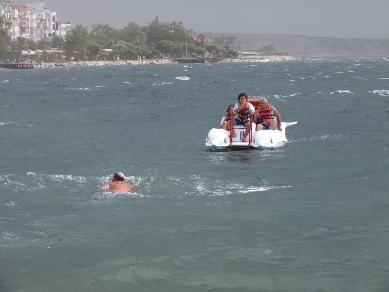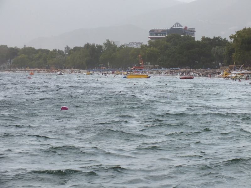 Yağmur yağmadı ancak fırtına tüm plajları esti geçti. Plajda güneşleyen tatilciler, havlu-sandalye ve şemsiye ve terliklerini toplayarak adeta kaçarcasına plajdan uzaklaştı.