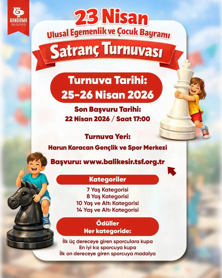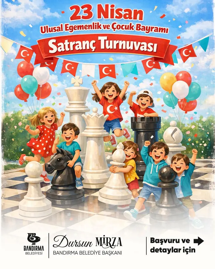 Bandırma Belediyesi olarak, Türkiye Satranç Federasyonu Balıkesir İl Temsilciliği iş birliğiyle 4 farklı kategoride gerçekleştireceğimiz Satranç Turnuvasına tüm çocuklarımızı davet ediyoruz.