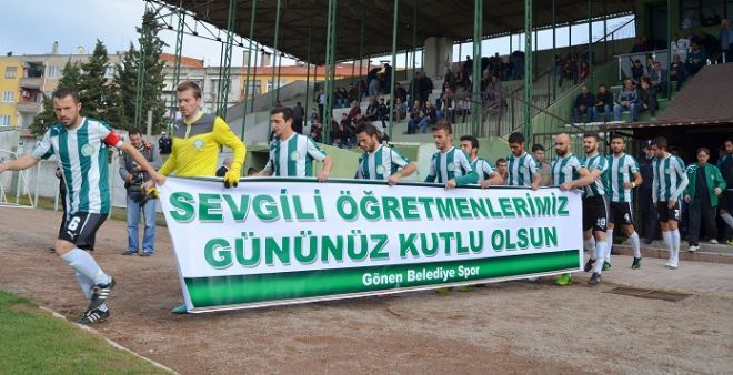 Sahasında lider Altınova Belediyespor’u konuk eden Gönen Belediyespor, yaklaşık 1200 taraftarının desteği ile yenik duruma düştüğü maçta 2-1 öne de geçmesine rağmen uzatmalarda yediği golle galibiyeti kaçırdı. Gönen, maça 24 Kasım Öğretmenler Günü’nü kutlayan bir pankartla çıktı.