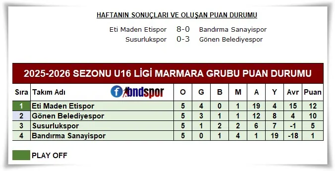 Grupta ilk sırayı alan takımın play-off oynama hakkı kazanacağı ligde 5.hafta maçları tamamlandı. Ligin 5.haftasında Etispor Sanayispor engelini 8-0'la, Gönen deplasmanda oynadığı Susurluk engelini 3-0'la geçerek grup birinciliği şanslarını son haftaya taşıdılar.