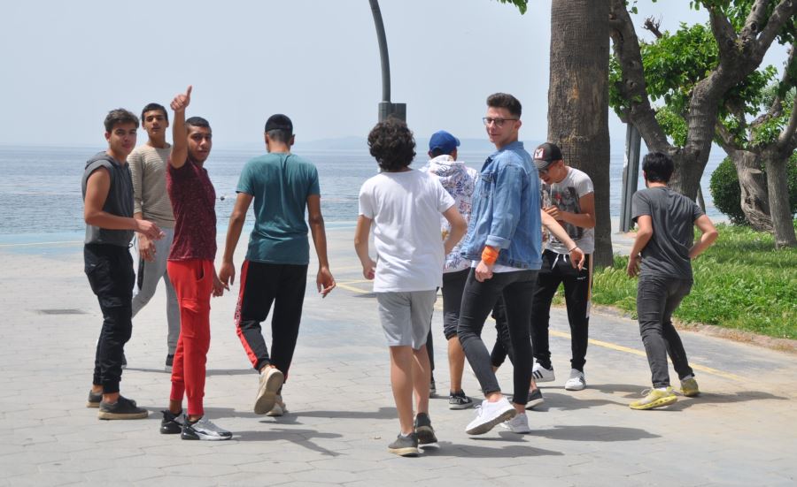 İlkkez uzun bir süre evlerinde kalmak durumunda bulunan gençler, Erdek'te Kurbağalı, Cuğra ve Kumluyalı sahilinde turluyarak günlük güneşlik havanın keyfini çıkarttılar.