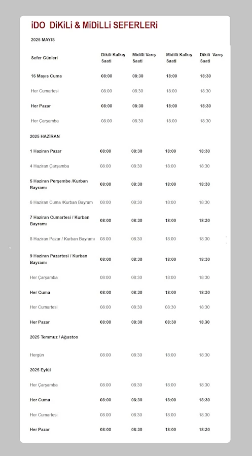 2 Ocak 2025 tarihinde satışa açılan Midilli Seferlerinin ilki 16 Mayıs Cuma saat 08.00’de gerçekleşecek. Kurban Bayramı’nda haftanın her günü sabah 08.00’de Dikili Limanı’ndan hareket edecek olan deniz otobüsü, Midilli’den de her akşam saat 18.00’de dönecek. Bayram tatili sonrası Haziran ayı sonuna kadar haftada 4 gün ; Çarşamba, Cuma, Cumartesi ve Pazar günleri olacak şekilde yine aynı saatlerde seferler düzenlenmeye devam edecek.