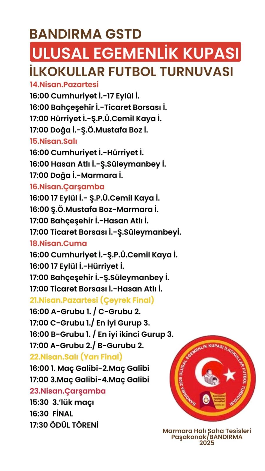 Bandırma Galatasaraylı taraftarlar derneğinin Türk futboluna genç yetenekler katma çabası ile önceki yıl başlattığı İlkokullar arası Ulusal Egemenlik Kupası, futbol turnuvası 14 Nisan pazartesi günü start alıyor.