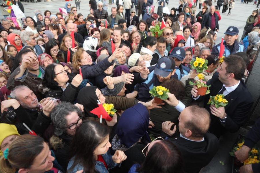 Belediye Başkanaı Av. Tolga Tosun, alanı dolduran kadınların 8 Mart dünya emekçi kadınlar gününü kutlarken, alana gelen tüm kadınlara topraklı, saksıda canlı çiçek armağan etti.