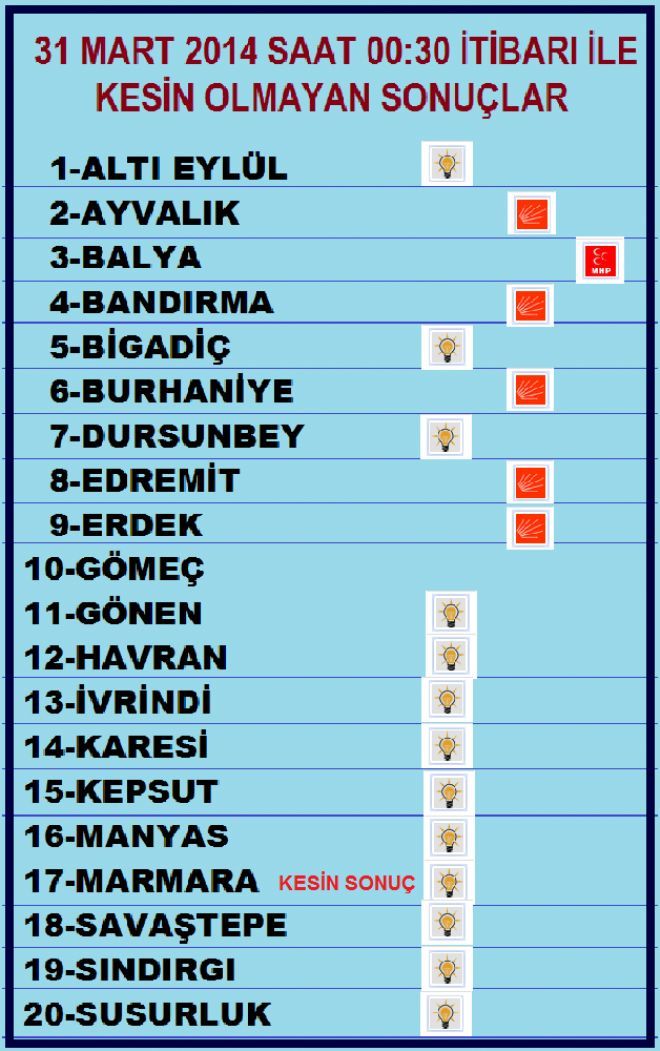 Balıkesir`de, Marmara hariç, kesin olmayan sonuçlara göre AKP 15, CHP 5 ve MHP 1 Belediye kazandı