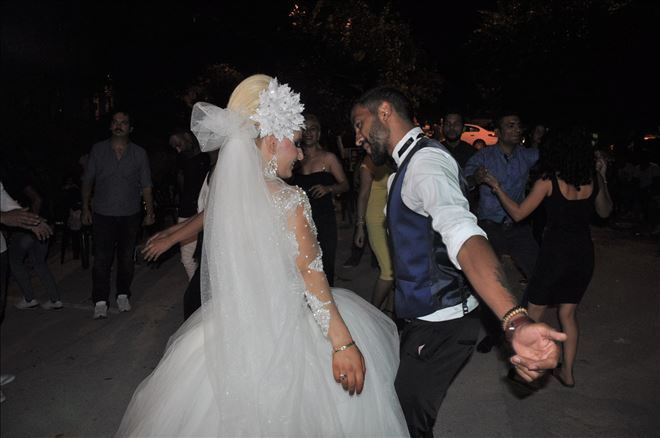 Geceye Kahverengi ekose yelekli takımla gelen bıçkın damat Hüseyin Onuş, Şaziye´sine kavuşmasına ramak kala raks ettiği piste dolar yağdı.