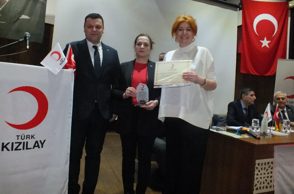 Kızılay Bandırma Şubesi aşevine sürekli bağışları dolayısıyla Toru Un Şirketi adına plaket ve teşekkür belgesi, Halil Özümüt tarafından, Murat Özgenç’e verildi.