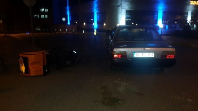 Kaza Atatürk Caddesinde şehir merkezine doğru seyretmekte iken, Belediye`nin köşesinden Pazartesi pazarı yönüne dönmek isteyen Fahri Meteler idaresindeki 10 PU 527 plaka sayılı özel otomobilin, Atatürk caddesinden şehir merkezine doğru seyretmekte olan Celil Dönmez  idaresindeki 45 EV 385 plakalı servis motoru çarpıştı.