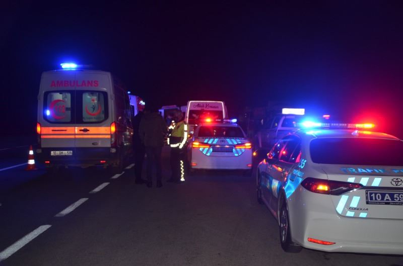 Korkunç kaza bu akşam saat 22.20 sularında meydana geldi. Gönen istikametine gitmekte olan İsmail Dere yönetimindeki 46 ACS 581 plaka sayılı TIR, Kırsal Hıdırköy kavşağından U dönüşü yapmak istediği anda, arkasından gelen Galip Dinçer'in kullandığı 10 AEM 464 plaka sayılı işçi minibüsünün çarpması ile meydana gelen kazada 2 kişi olay yerinde 1 kişi hastanede hayatını kaybetti. 10 Kişi yaralı olarak kaldırıldıkları Bandırma Devlet Hastanesinde tedavi altına alındı.