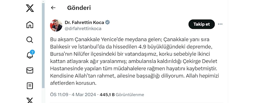 Koca yaptığı açıklamada; Bu akşam Çanakkale Yenice’de meydana gelen; "Çanakkale yanı sıra Balıkesir ve İstanbul’da da hissedilen 4.9 büyüklüğündeki depremde, Bursa’nın Nilüfer ilçesindeki bir vatandaşımız, korku sebebiyle ikinci kattan atlayarak ağır yaralanmış; ambulansla kaldırıldığı Çekirge Devlet Hastanesinde yapılan tüm müdahalelere rağmen hayatını kaybetmiştir. Kendisine Allah’tan rahmet, ailesine başsağlığı diliyorum. Allah hepimizi afetlerden korusun." diyerek acı haberi duyurdu.