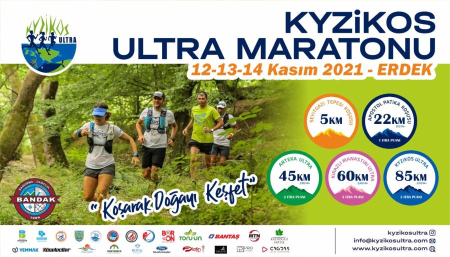 Bandırma Dağcılık Arama ve Kurtarma Derneği (BANDAK) tarafından ilki 2019 yılında düzenlenen Kyzikos Ultra Maratonu, bir yıllık pandemi arasından sonra 12 - 14 Kasım tarihleri arasında Erdek’te koşulacak. Yurtiçi ve yurtdışından 500 sporcunun katılımıyla gerçekleşecek maraton, 85 kilometrelik Kyzikos Ultra, 60 kilometrelik Kirazlı Manastırı Ultra, 45 kilometrelik Arteka Ultra, 22 kilometrelik Apostol Patika ve 5 kilometrelik Seyitgazi Tepesi Halk koşusunu içeren beş etaptan oluşuyor.