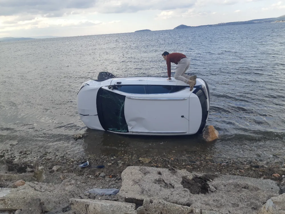 Dikkatsizlik sonucu meydana gelen kazada denize düşerek yana devrilen 10 AFA 613 plakalı otomobilin sürücüsü, Balıkesirli Özay Ergin, kazayı yara almadan atlattı.