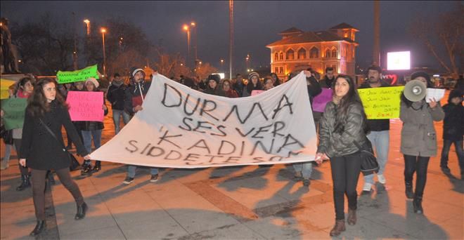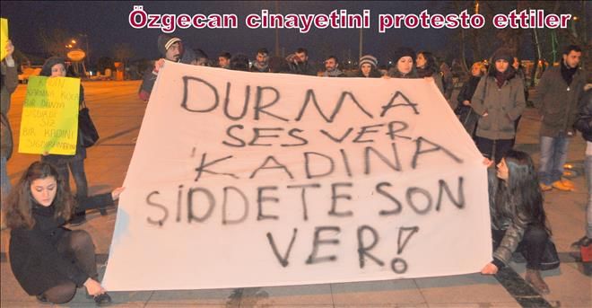 Grup adına bildiri okuyan genç bir Bayan Özgecan'ın katilini tarif ederken; Katiller her yerde, bazen dolmuşta evimize gitmeye çalışırken, bazen sokakta onlarca kişinin gözünün önünde. Çoğu zaman evin içinde.. Bazen, ayrılmaya çalışırken, bazen çalışırken ve her daim ağzını köpürte köpürte konuşurken!