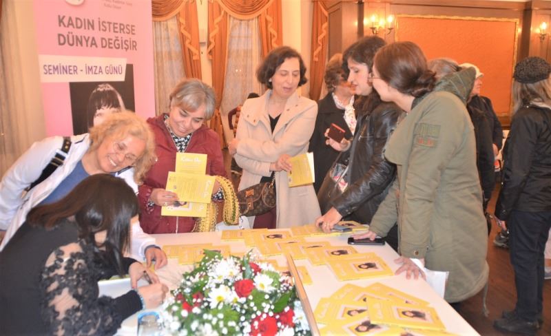 Akyüz daha sonra kendisini dinlemeye gelen okuyucularına kitabını imzaladı.