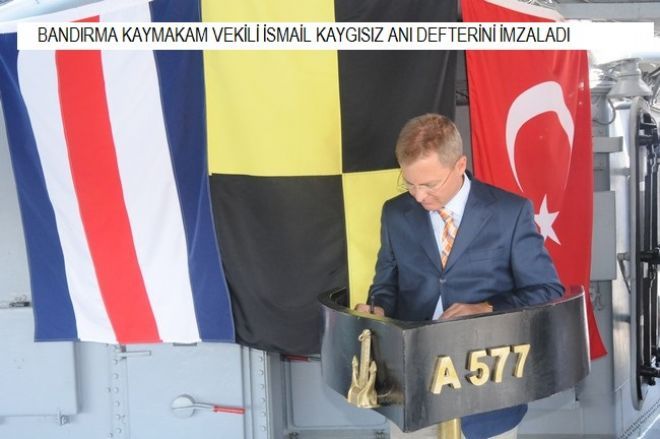 Ziyarette Bandırma Kaymakamlığına vekâlet eden Erdek Kaymakamı İsmail Kaygısız, 6.Jet Hava Üs Komutanı Garnizon Komutanı Tuğgeneral Mehmet Uğur Balkış, Belediye Başkan Vekili Tolga Tosun, İlçe Emniyet Müdürü Yusuf Aki ve Eğitim Filotillası Komodoru Dz. Kur. Kd. Alb. Sinan Sürer yer aldı.
