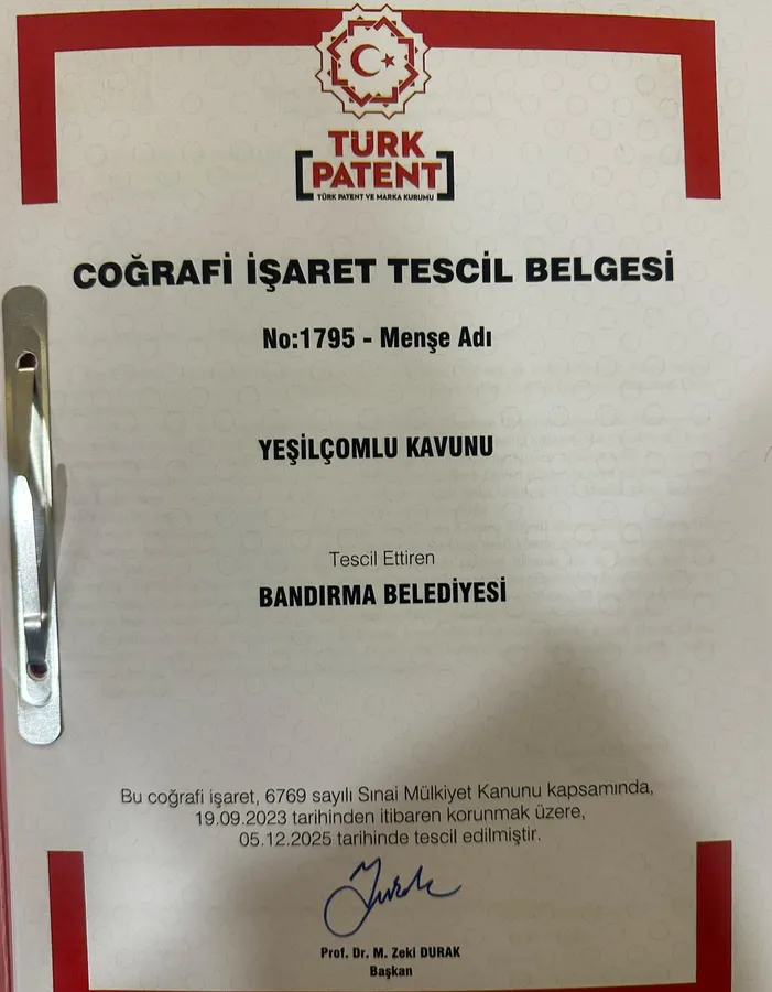 Yeşil Çomlu kavunu Bandırma Belediyesi tarafından coğrafi işaret tescil belgesi alarak resmen tescillendi.