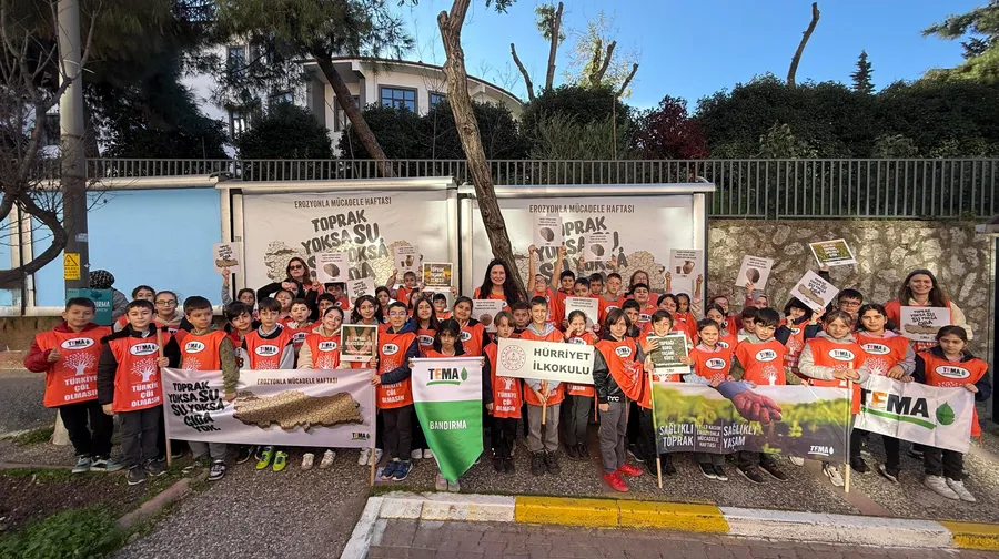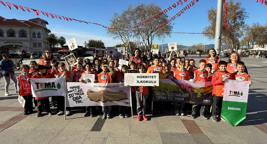 17-30 Kasım ‘Erozyonla Mücadele Haftası’ etkinlikleri kapsamında, 25 Kasım 2025 tarihinde, TEMA Vakfı Bandırma İlçe Sorumluluğu öncülüğünde, Bandırma Hürriyet İlkokulu 4. sınıf öğrencileri, anlamlı bir farkındalık yürüyüşü gerçekleştirdiler. Minik TEMA gönüllüleri, ‘Toprak yoksa su, su yoksa gıdı yok’ temasıyla okul binalarından başlayarak kentin kalbi Cumhuriyet meydanına kadar yürüdüler. Yürüyüş boyunca, güzergâh üzerindeki vatandaşlara ve esnaflara el broşürleri dağıtılarak, erozyonun küresel boyutları ve yerel etkileri hakkında bilgilendirme yapıldı. Etkinlik, Bandırma halkının konuya ilgisini artırarak, toprağa sahip çıkma bilincinin yayılmasına önemli katkı sağladı.”