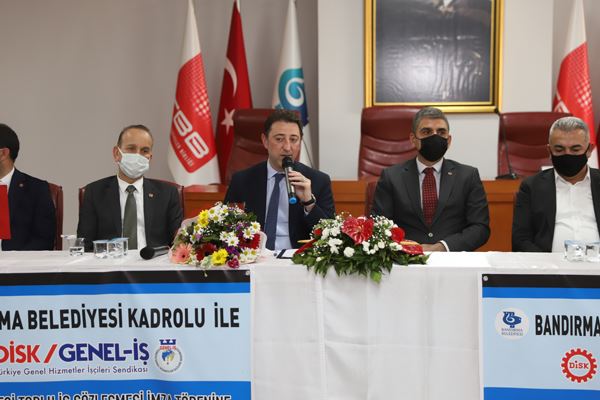 Genel-İş Sendikası Genel Başkanı Remzi Çalışkan ise yaptığı konuşmada: “Yaşadığımız zorlu pandemi koşullarında işçi arkadaşlarımız çalışmaya devam ediyor. Sadece toplu sözleşmelerde değil, her zaman iş, emek ve demokrasi mücadelesine devam ediyoruz. Hayatın her alanında işçi arkadaşlarımızın yanında yer alıyoruz. Emeği geçen Belediye Başkanımız Av. Tolga Tosun’a, Belediye yetkililerimize teşekkür ediyorum. Toplu iş sözleşmesi Bandırmaya, Belediyemize ve çalışanlarımıza hayırlı olsun” dedi.