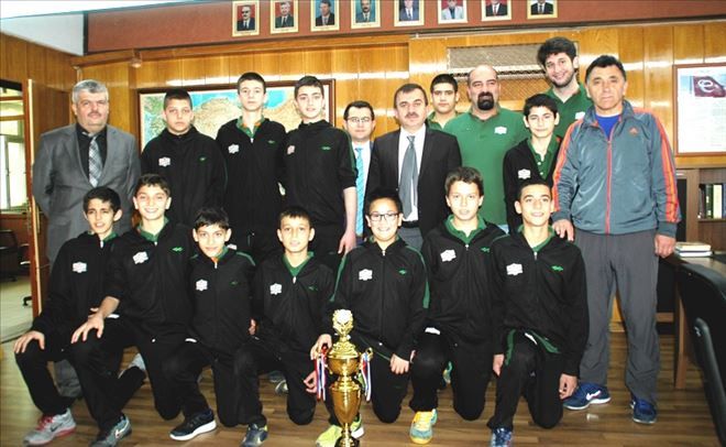 Vecihibey Ortaokulu müdürü Osman Kızılcık, Banvit Altyapı Menajeri Bedirhan Oktay ve Banvit Altyapı Antrenörü Alp Baydar ile beraber kupalarını Osman Özkan´a getiren çocuklar ´´söz verdik şampiyon olduk´´ dediler.