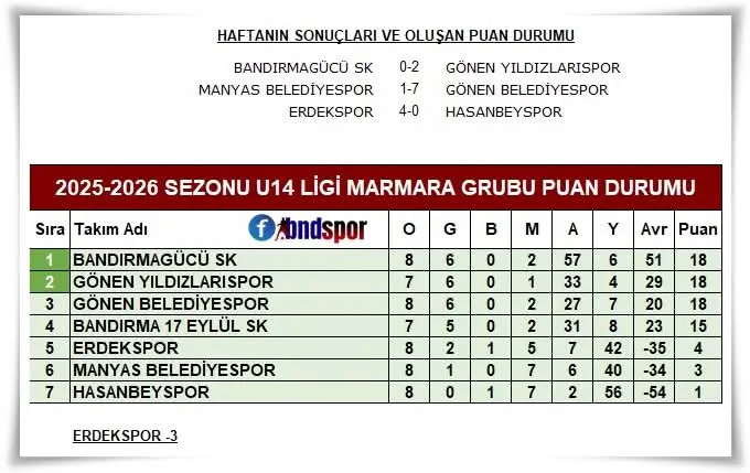 Grupta lider durumda olan Bandırmagücü SK'yı Ömer Yusuf Çeribaşı ve Efe Ercan'ın golleriyle 2-0'lık net skorla geçen Gönen Yıldızlarıspor, şampiyonluk yarışında ben de varım dedi. Bu galibiyetle bir maçı eksik olmasına rağmen lider ile puanını eşitleyen Arda Dikiciler'in öğrencileri , puan cetvelinde genel averaj nedeniyle ikinci sırada görünse de 9.haftayı gizli lider olarak kapadı. EKREM NAYAN