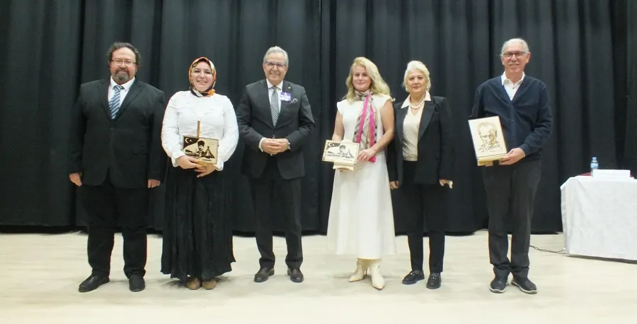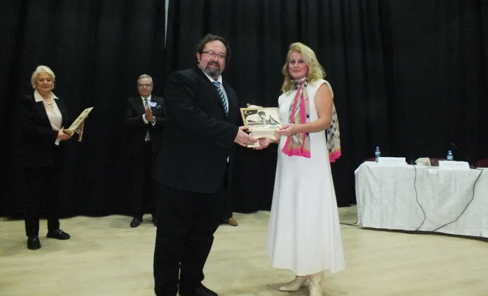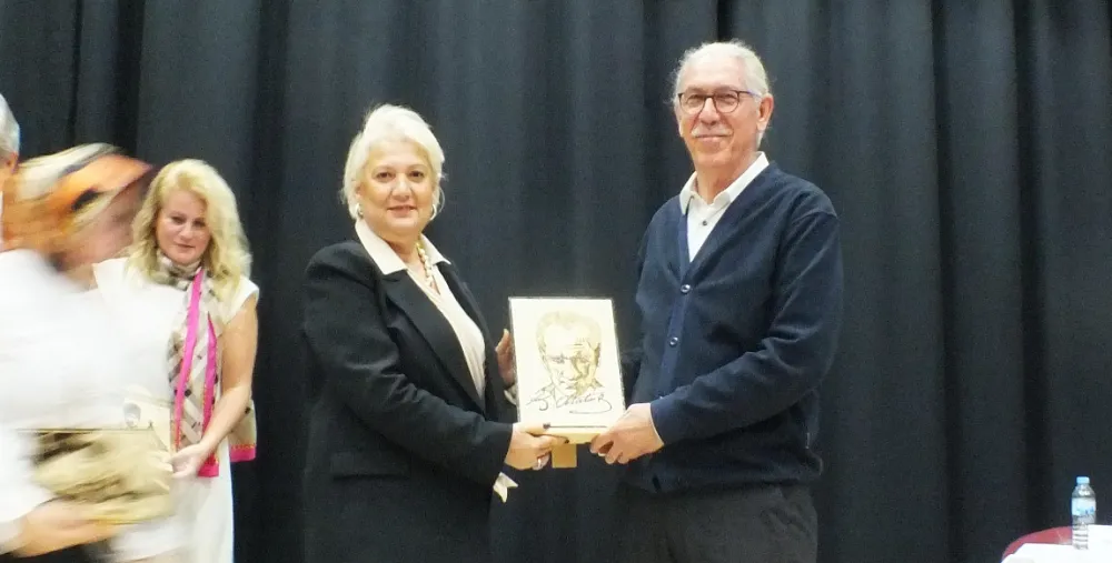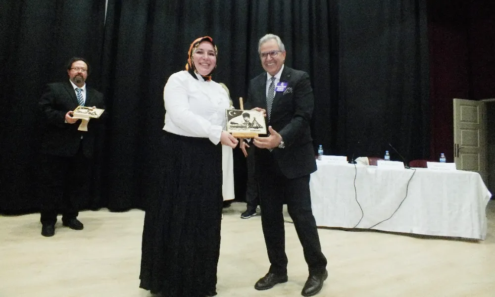 Söyleşiye katkı veren Atlıakın, Tanyeri ve Gönen'e katılımları dolayısı ile günün ahşap yakma anı panosu verildi.