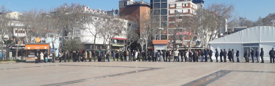 Piyasa şartlarına göre daha ucuz olan pideyi alabilmek için sıraya giren vatandaşlar Cumhuriyet Meydanı’ndaki satış noktasından itibaren 300 adıma yakın kuyruk oluşturdu.