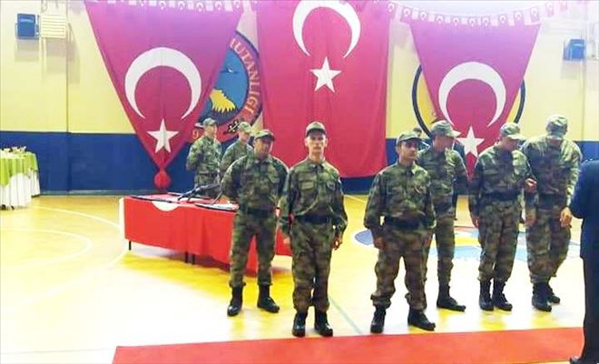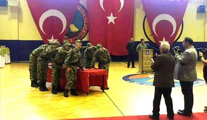 Al bayrağın üzerindeki silahlara el koyarak askerlik yemini eden 5 engelli genç vatan borcunun ödemenin coşkusunu aileleri ile paylaştı.