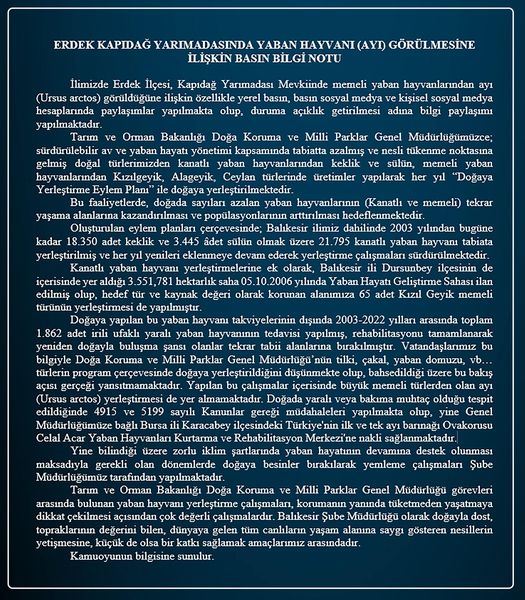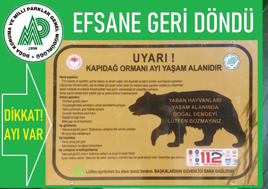 “Yerel basında çıkan haberler ve arazide yapılan araştırmalar neticesinde, Erdek Kapıdağ Yarımadası’nda varlığı tespit edilen ayı (Ursus arctos)’un muhtemel yaşam alanları olarak belirlenen noktalara vatandaşlarımızın bilgilendirilmesi amacıyla uyarı tabelaları yerleştirilmiştir.” Teşekkürler “Doğa Koruma ve Milli Parklar”