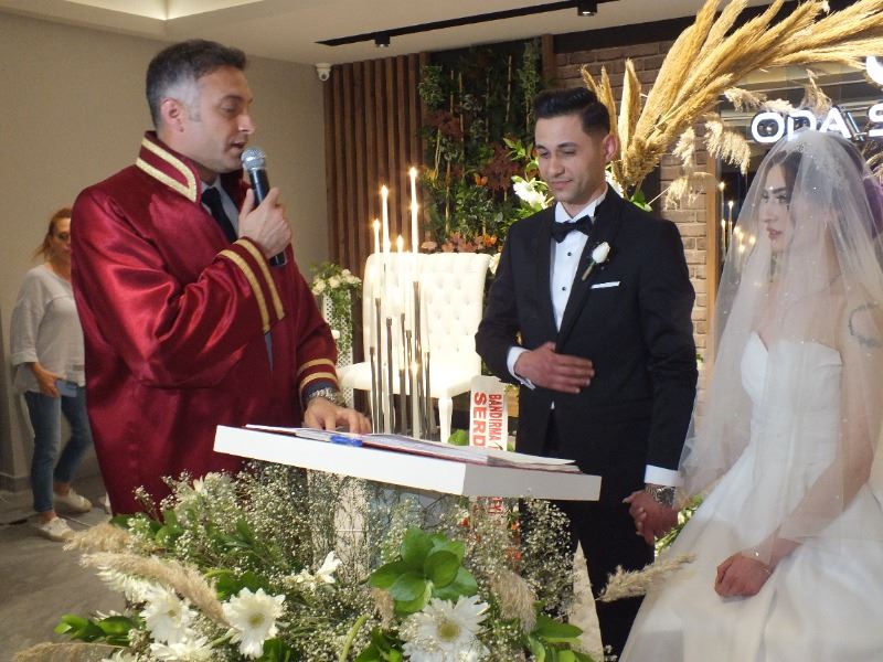 Bandırma'nın yakışıklı delikanlılarından Banvit personeli Berhan Uzgur ile Ocaklar'ın güzel kızlarından Dilay Kaplan'ın yaz sezonunda başlayan arkadaşlıkları bu akşam Oda salonda düzenlenen törende kıyılan nikah ile noktalandı.