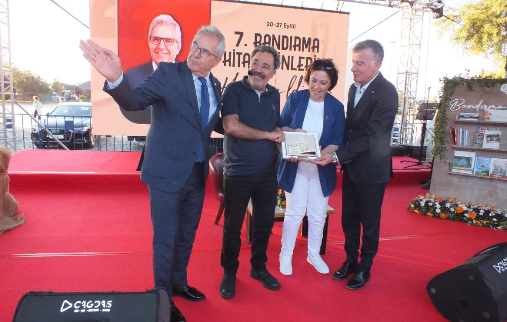 Söyleşinin ardından Ümit’e plaketini Belediye Başkanı Dursun Mirza, belediye meclis üyesi Bilgen Süngü ve CHP Bandırma Kadın Kolları Başkanı Filiz Özdemir verdi. ÖNDER BALIKÇI