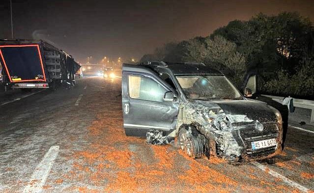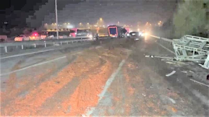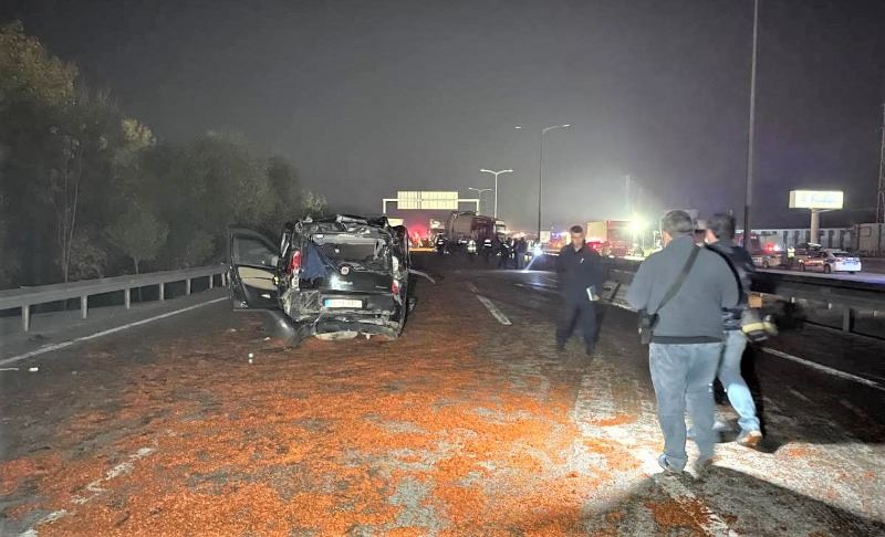 Bandırma-Balıkesir karayolu Yeniköy mevkiinde seyir halindeki tır’ın dorsesinden yola dökülen salçalar zincirleme kazaya neden oldu.