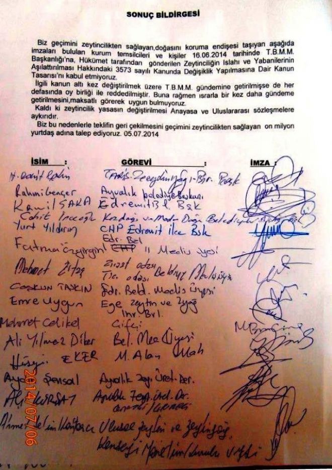 “Biz geçimini zeytincilikten sağlayan, doğasını koruma endişesi taşıyan aşağıda imzaları bulunan kurum temsilcileri ve kişiler,16.06.2014 tarihinde TBMM Başkanlığı’na hükümet tarafından gönderilen Zeytinciliğin Islahı ve Yabanilerin Aşılattırılması Hakkındaki 3573 sayılı Kanunda Değişiklik Yapılmasına Dair Kanun Tasarısı’nı tanımıyoruz. İlgili kanun altı kez değiştirilmek üzere TBMM gündemine gelmişse de her defasında oy birliği ile reddedilmiştir. Buna rağmen ısrarla bir kez daha gündeme getirilmesini maksatlı görerek uygun bulmuyoruz. Kaldı ki zeytincilik yasasının değiştirilmesi Anayasa ve uluslar arası sözleşmelere aykırıdır. Bu nedenle teklifin geri çekilmesini geçimini zeytincilikten sağlayan on milyon yurttaş adına talep ediyoruz” denildi.
