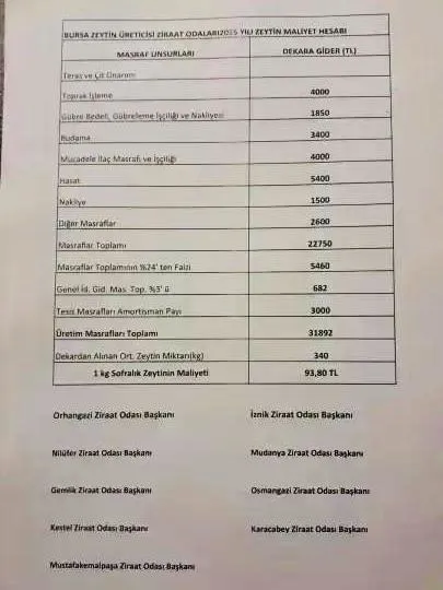 Yapılan toplantı sonrasında Bursa genelinde zeytinin kilogram maliyeti belirlendi. Yapılan değerlendirme sonrasında dekar başına toprak işleme 4 bin TL, Gübre bedeli, gübreleme işçiliği ve nakliye bedeli bin 850 TL, budama 3 bin 400 TL, Mücadele, ilaç masrafı ve işçiliği 4 bin TL, hasat 5 bin 400 TL, Nakliye bin 500 TL, diğer masraflar 2 bin 600 TL olmak üzere toplam 22 bin 750 olarak belirlenirken, masraflar toplamının yüzde 24 faizi 5 bin 640 TL, Genel İdare masraflar toplamı yüzde 3 olmak üzere 682 TL, Tesis masrafları amortisman payı 3 bin TL, üretim masrafları toplamı 31 bin 892 TL olarak belirlendi. Dekardan alınan toplam zeytin kilogramı 340 kilogram olarak belirlenirken, sofralık zeytinin kilogram maliyeti ise 93,80 TL olarak açıklandı.